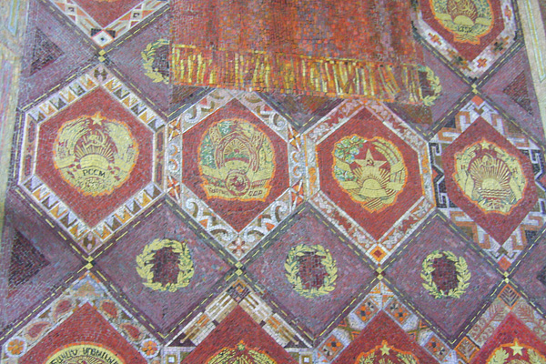 Центральная часть триптиха вестибюля станции Добрынинская кольцеваяЦентральная мозаика – портрет В. И. Ленина в окружении гербов союзных республик. Изображение В. И. Ленина нанесено на кумачовое полотно, свисающее с карниза в обрамлении цветочной гирлянды. Здесь интересно отметить параллель с традиционными средневековыми легендами о спасе нерукотворном, если принять красное полотнище за ширинку – особого рода полотенце, зачастую используемое для подачи «хлеба-соли» в обрядах русской деревенской жизни. Подчеркивает эту ассоциацию и золотая бахрома по низу полотнища. Изображение переливается оттенками красного, создавая эффект волны на ткани.